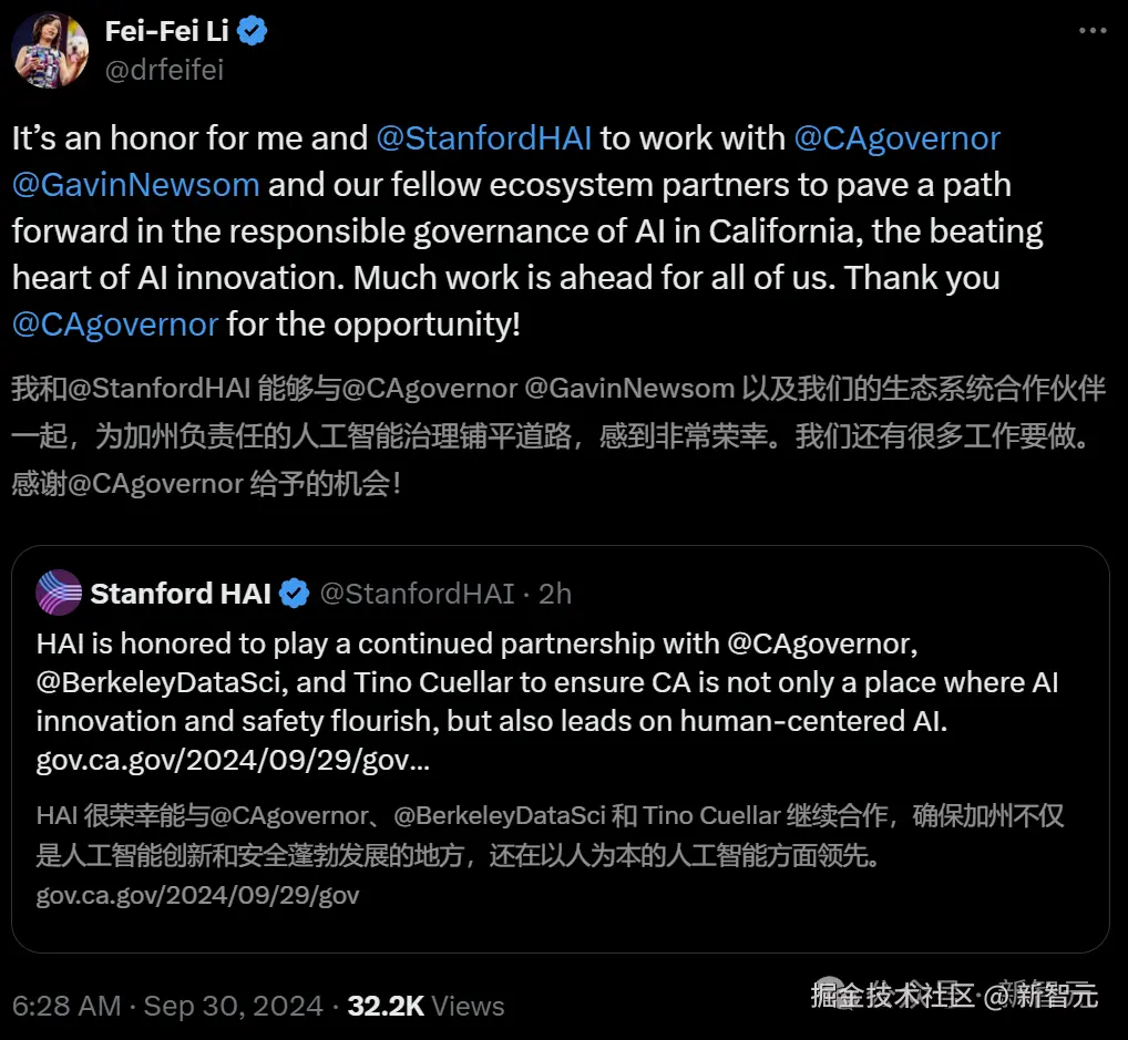 斯坦福教授李飞飞开心地表示,自己能和 StanfordHAI 一起,为加州负责任的 AI 治理铺平道路,深感荣幸。