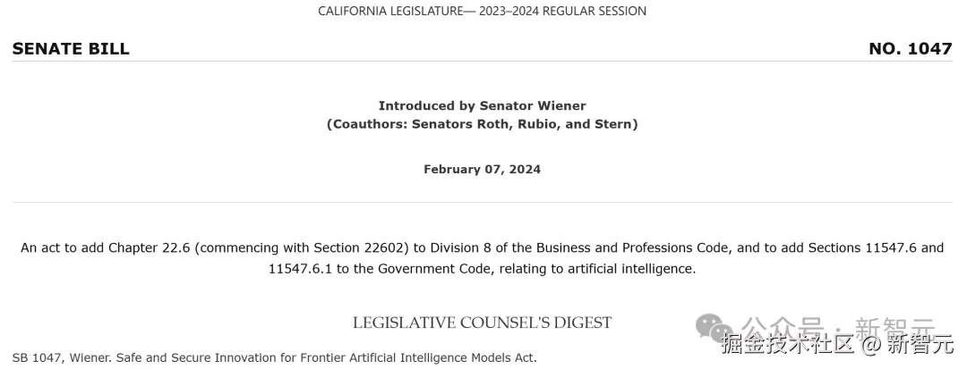 而今年 2 月,加州直接拟定了法案,名为《SB-1047 前沿 AI 大模型安全创新法案》,对于大模型安全、透明的使用给出了更具体的条例。