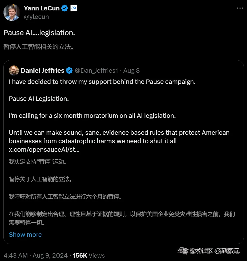 甚至,LeCun 还照搬了之前要求暂停 AI 研究时的原梗——请暂停 AI 立法六个月!