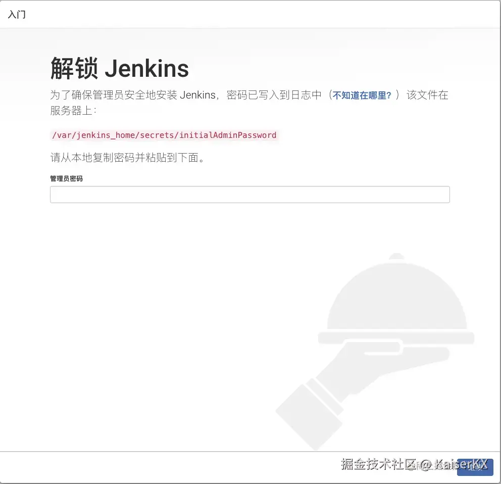 初次登录,我们需要输入密钥,同时也是admin用户的密码(建议不要修改)可以通过以下命令找到: