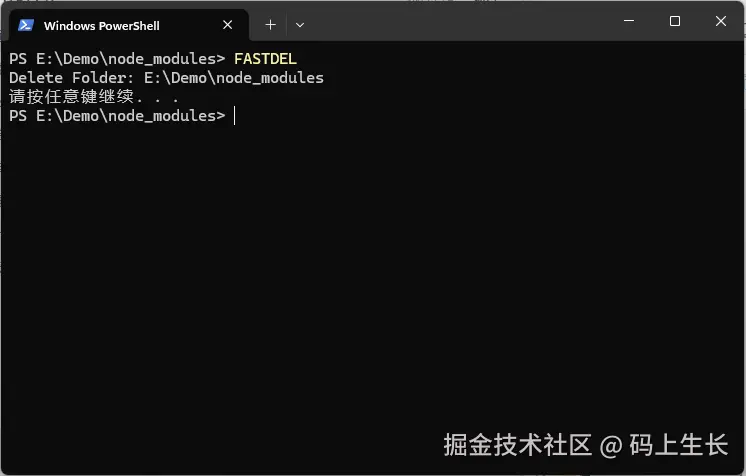 之后,在你要删除的文件目录下,打开Windows PowerShell命令窗口,然后输入命令FASTDEL进行删除即可,如下所示:
