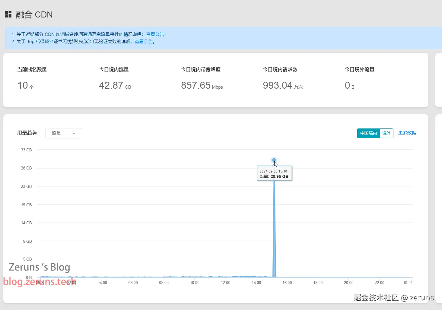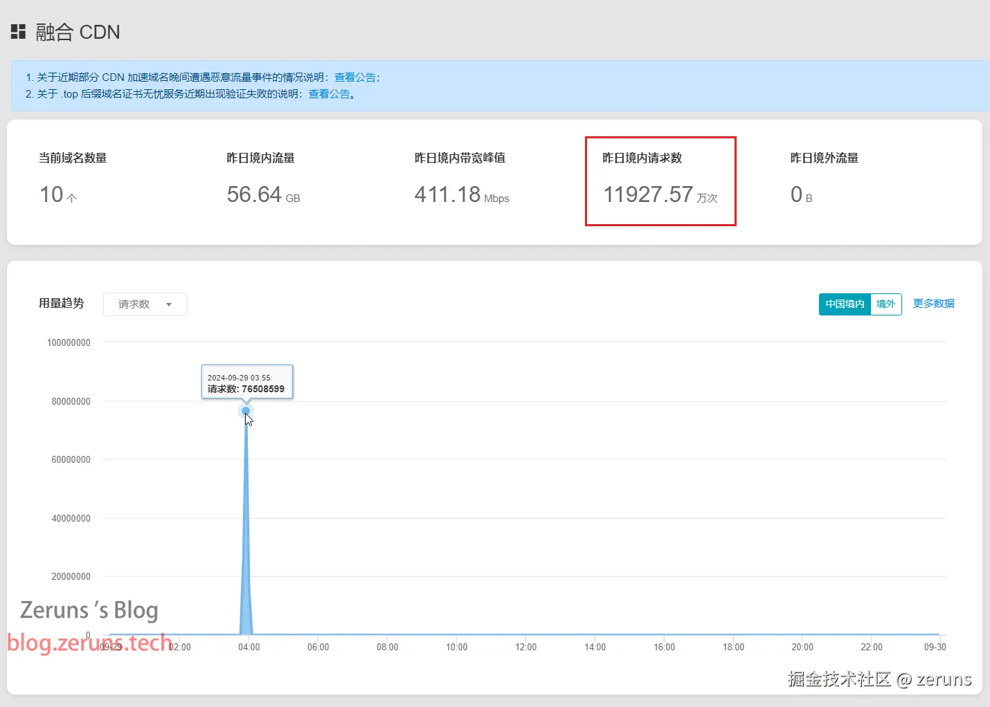 2024.9.29凌晨4点攻击开始,攻击目标是我的图床tc.zeruns.tech和博客blog.zeruns.tech,图床用的cdn是多吉云融合CDN,流量被刷了20GB左右就触发峰值关闭CDN了,HTTPS请求次数被刷了1.1亿次,因为设置了QPS,实际计费的请求次数在1500万次左右,共损失50元左右。