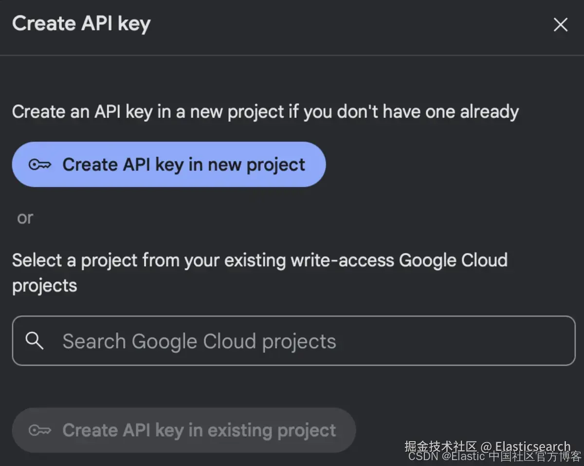 如果你尚未登录,系统将提示你登录。登录后,你将看到两个选项:在浏览器中使用 AI Studio 测试 Gemini 提示或创建 API 密钥。我们将创建一个 API 密钥以允许 Elasticsearch 连接到 AI Studio。