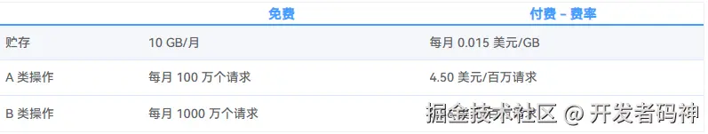 - B 类操作:每月 1000 万次(下载与访问操作)