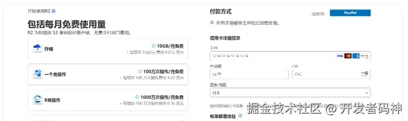 在 Cloudflare 控制面板的左侧栏找到 R2,点击进入并开通 R2 服务。开通时可以绑定支持外币支付的信用卡,或者使用 PayPal(中国区 PayPal 也是支持的)。