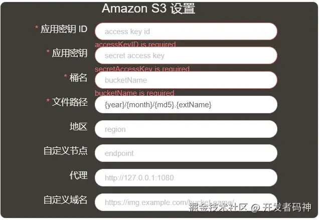 安装完成后,进入 PicGo 图床设置,选择 Amazon S3 作为图床类型。然后填入以下配置信息: