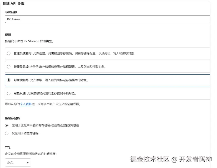 - 创建 API 令牌,并确保赋予对象 读写 权限。在 API 令牌设置中可以选择永久有效期。