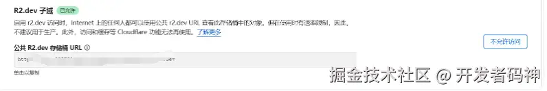 - 关闭 R2.dev 子域名 如果你使用了自定义域名,建议关闭默认的 R2.dev 子域名。