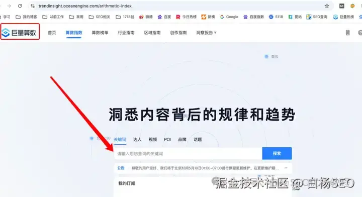 不管是我们是手动还是用了第三方工具找到的短词,为了验证这个词在抖音上到底有没有流量,有多少流量,这里就要用到抖音官方的免费指数工具——聚量算数工具。(当然如果你有投巨量广告,可以去千川后台看月搜索量)