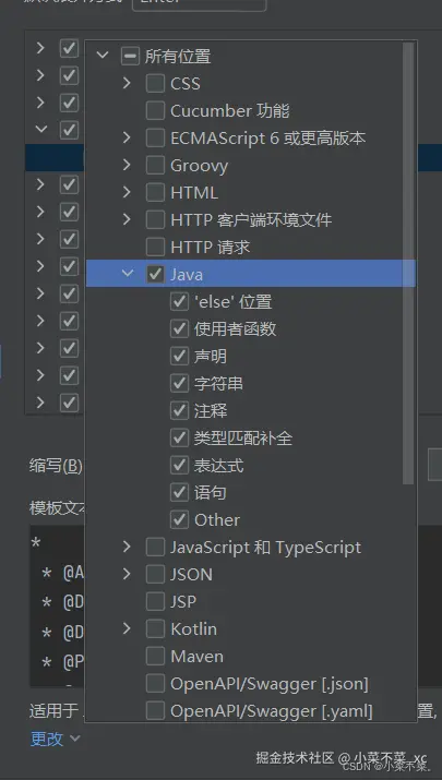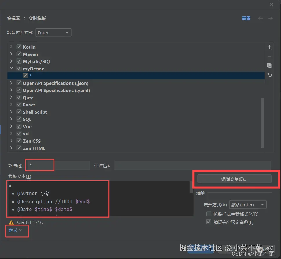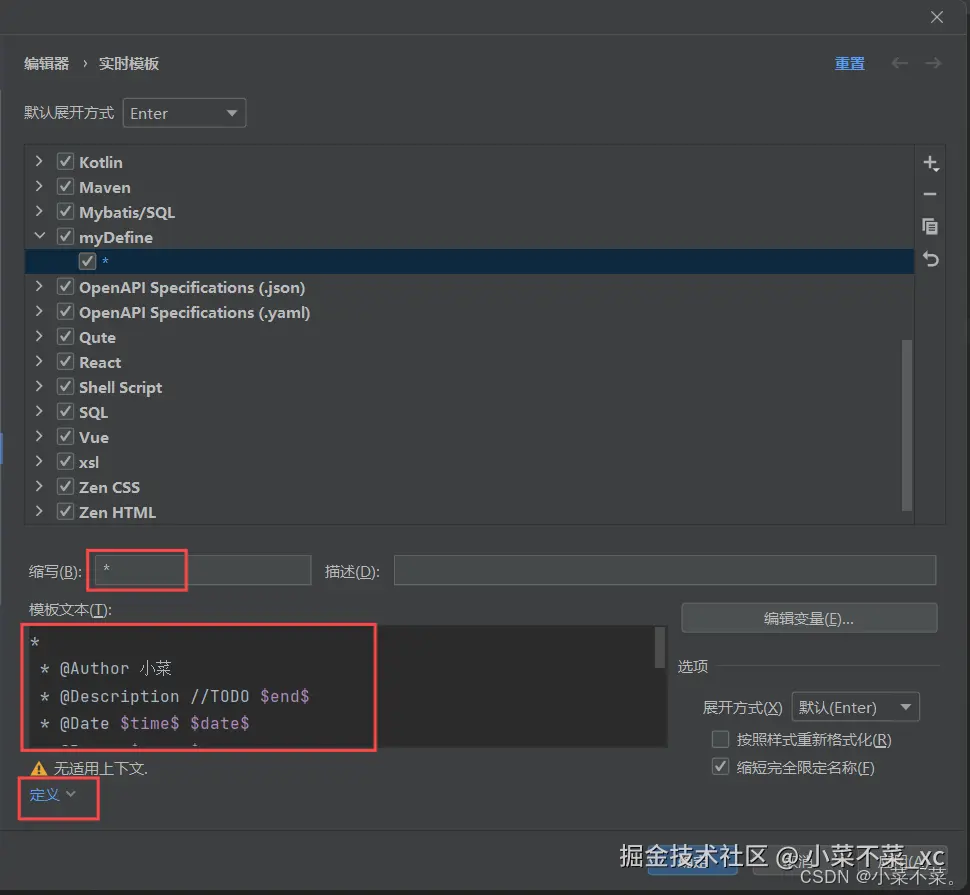 3.点击 定义,跳出的界面中选择Java,或者可以添加一些别的,那样你在创建对应的备注时会跳出备注