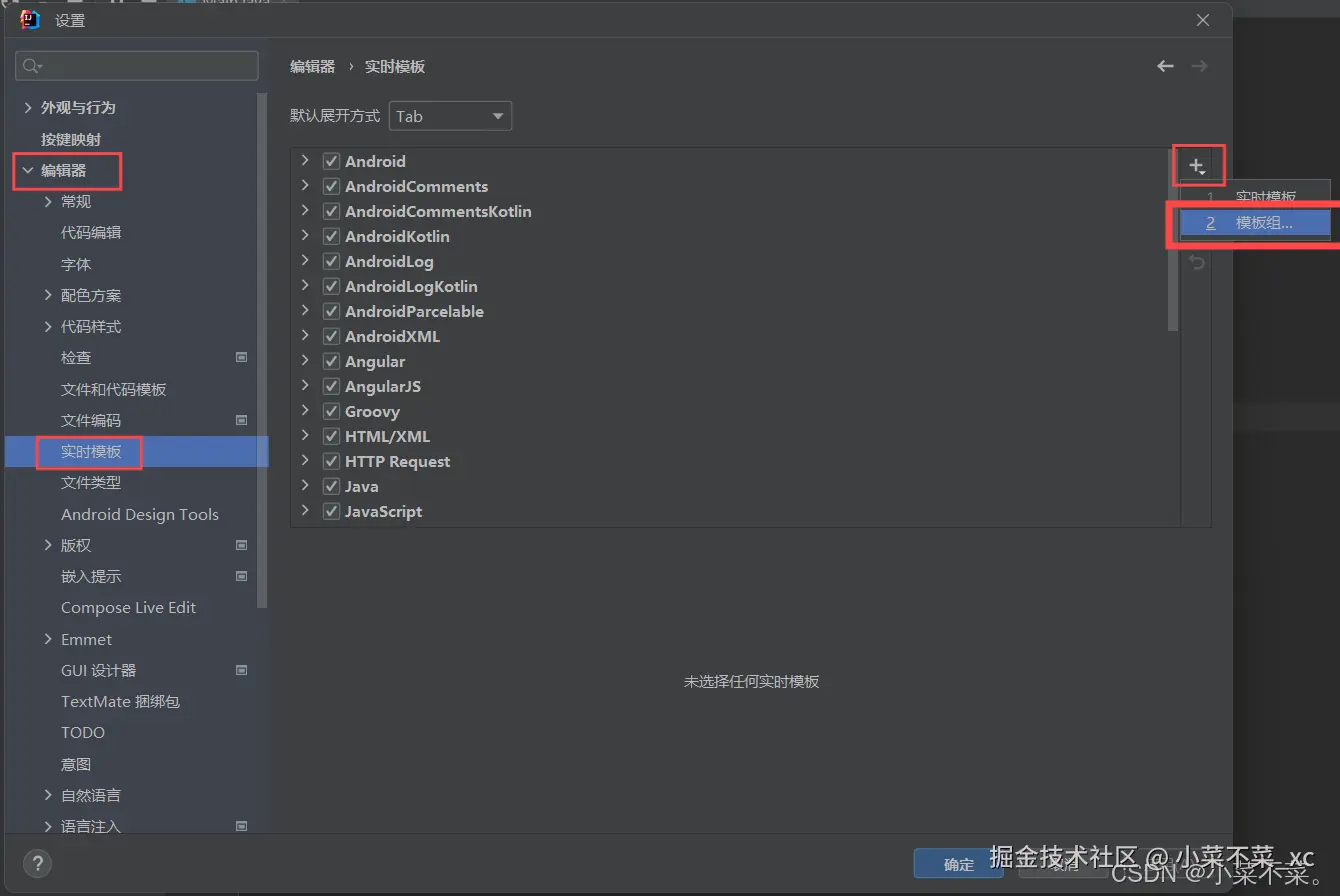 在跳出的设置界面中依次点击 编辑器 -> 实时模板 -> 右侧的加号 -> 模板组
