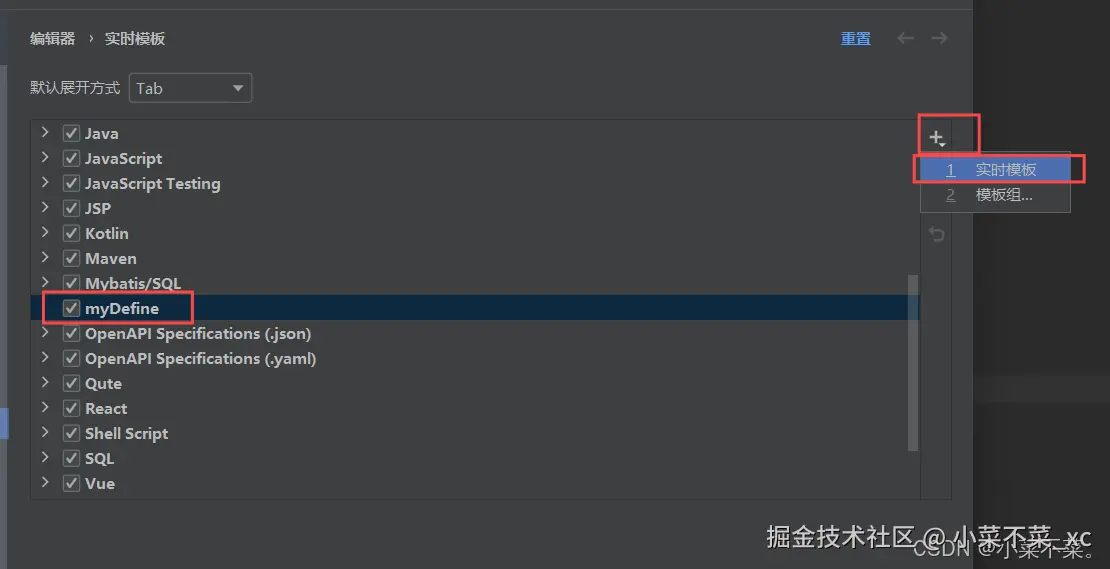 接着选中刚刚创建的组 ,再点击右侧的加号 -> 实时模板 添加模板