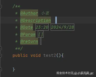 最后再使用/**添加备注时,就会跳出我们配置的信息,我们再后面填写信息,就可以让我们很快明白这个方法的创作者,作用,时间,参数等信息了