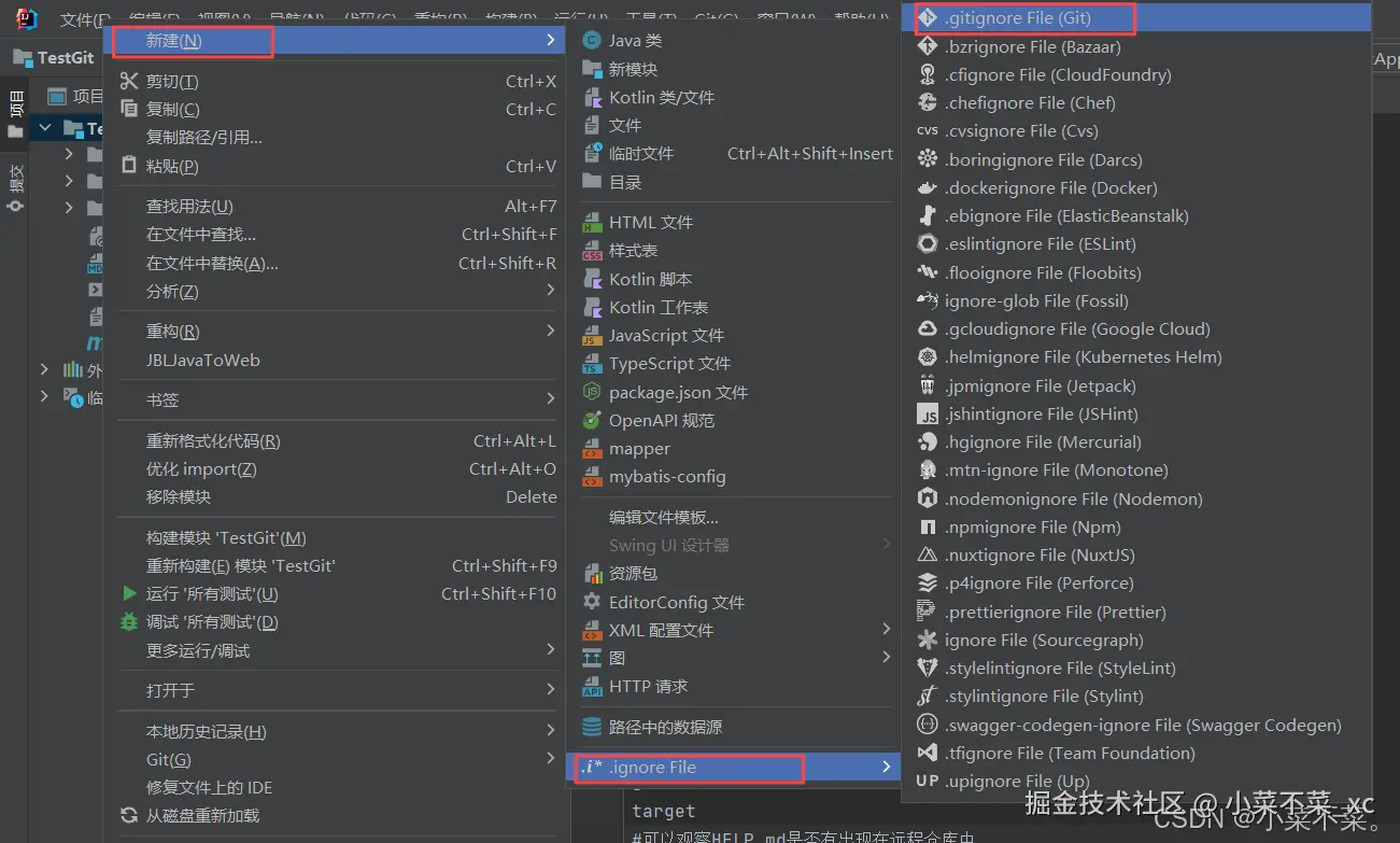 安装成功后在项目中 右键新建 -> .ignore File -> gitignore File(Git)