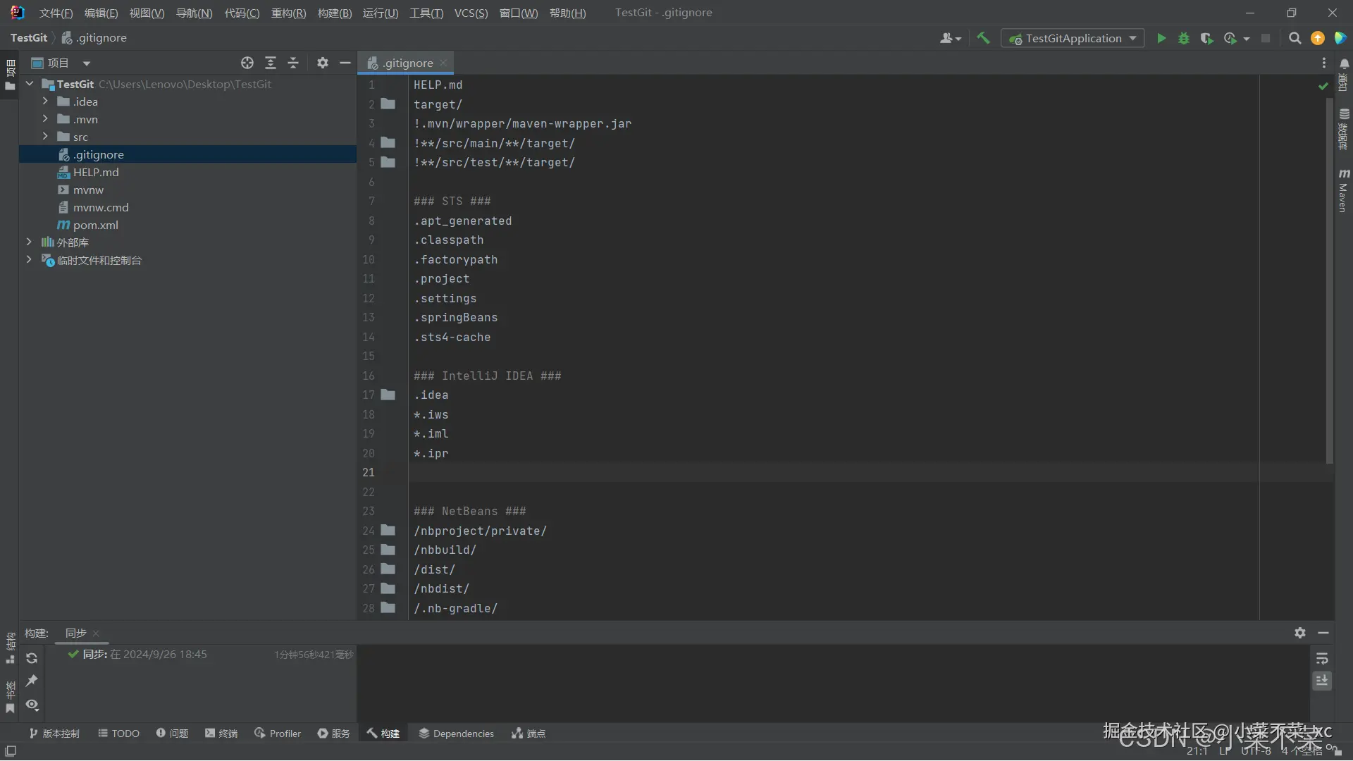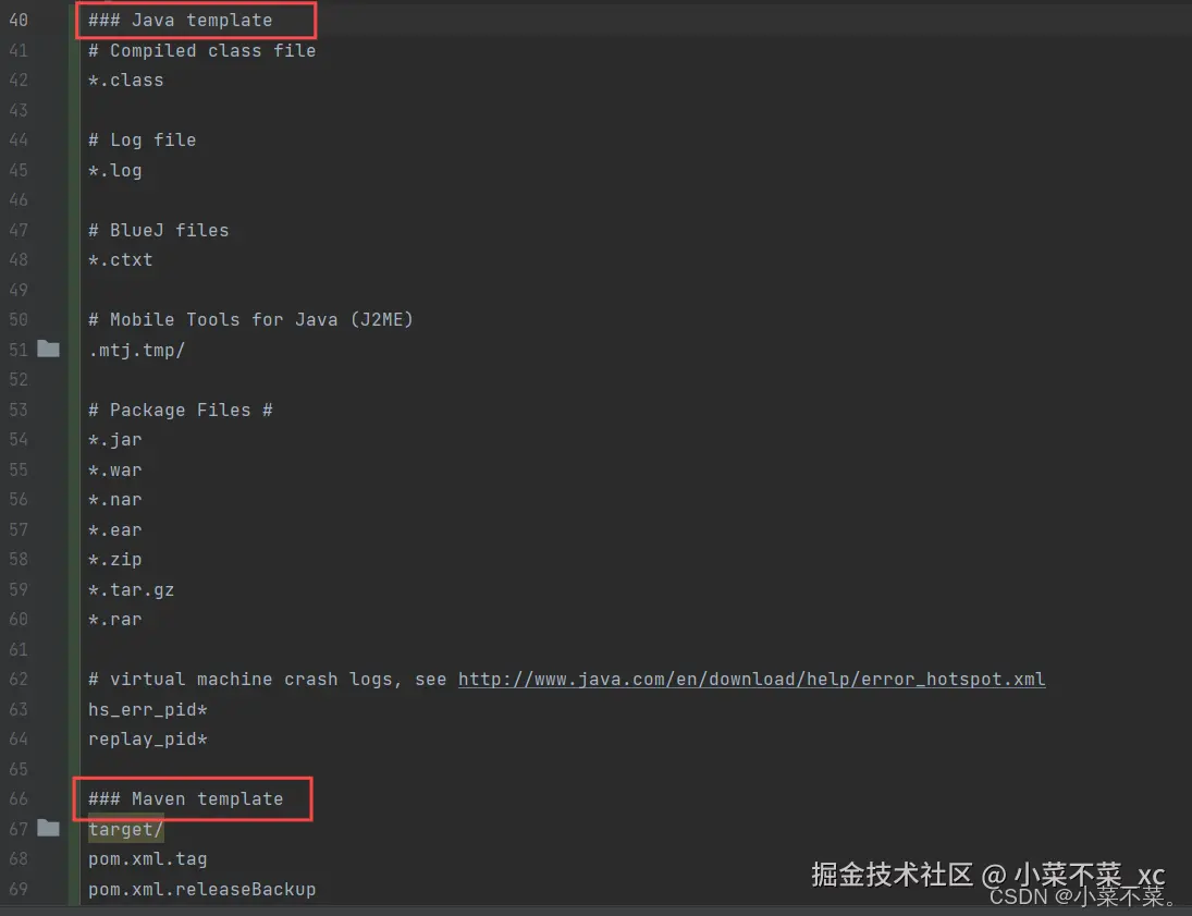 这样就会自动生成一个.gitignore文件,要是原来已经有.gitignore文件了,那.gitignore文件中也会添加上刚刚选择想要忽略的文件,我这里就多了一些有关Java和Maven的忽略文件