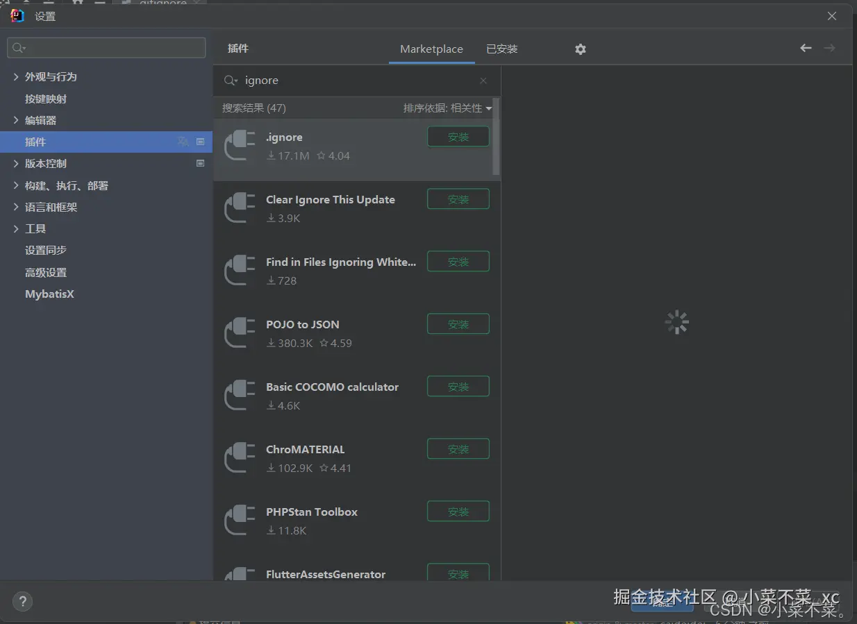 点击上方的 文件 -> 设置 -> 插件 -> 搜索.ignore ->安装