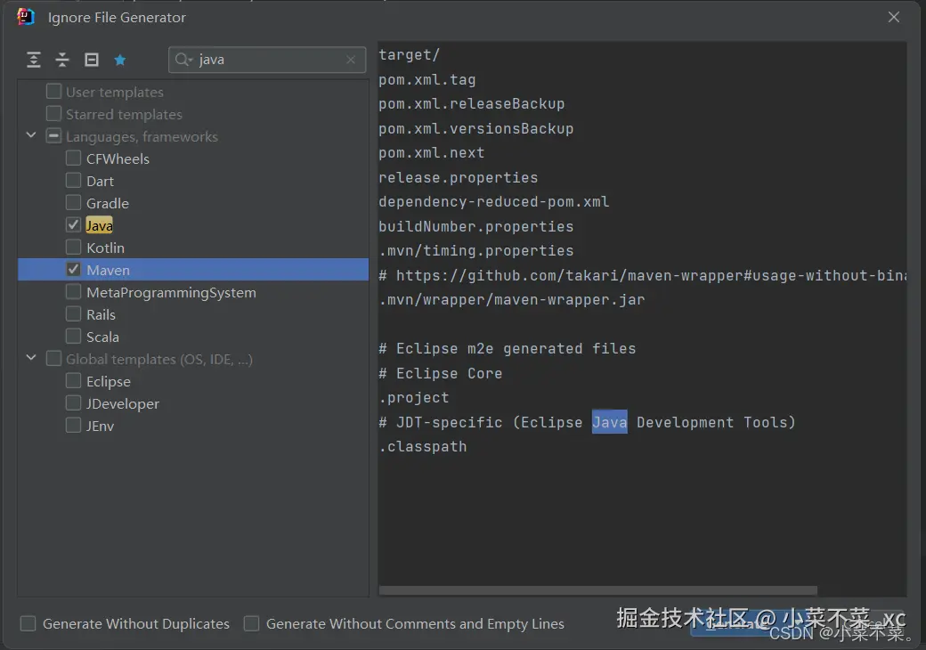 在跳出的界面中选择,我这里选择了Java和Maven,这样生成的.gitignore文件就会自动忽略一些有关Java和Maven的无用信息
