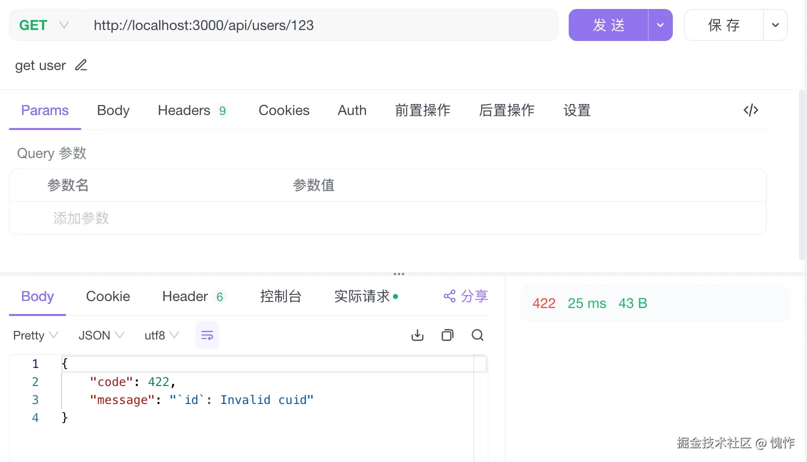 但此时触发数据验证失败,响应的结果令人不是很满意。下图为访问 /api/todo/xxx 的响应结果(其中 xxx 不为 cuid 格式,因此抛出数据验证异常)