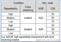 SHT3X支持12种工作模式,分别有高,中,低三档可选刷新率。mps=0.5,1,2…时,分别代表每两秒采集一次数据,每秒采集一次数据,每秒采集两次数据…