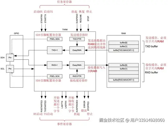 nRF52832 的 TWI 的原理框图如下图所示,TWI 主机通过触发STARTTX 或STARTRX 任务启动TWI 传输,通过触发 STOP 任务停止 TWI 传输。TWI 主机在挂起时无法停止,因此必须在 TWI 主机恢复后触发 STOP 任务停止 TWI。启动 TWI 主机后,在TWI 主机停止之前,即在 LASTRX,LASTTX 或 STOPPED 事件之后,不应再次触发 STARTTX 任务或STARTRX 任务。如果从机产生 NACK 输入,那么 TWI 主机将产生ERROR 事件。