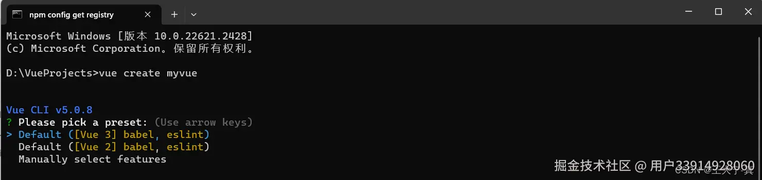 1、首先在D盘新建一个文件夹(vuetest)作为项目存放地,然后使用命令行cd进入到项目目录输入:vue create xxxx 创建vue项目(xxxx是你的项目名称,自定义),出现下图表示成功。