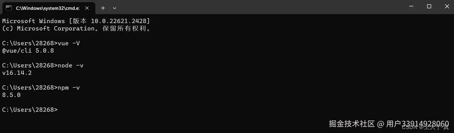 3、然后分别输入vue -V(这是大写的V) node -v 和 npm -v查看相应的版本号。出现下图表示成功。