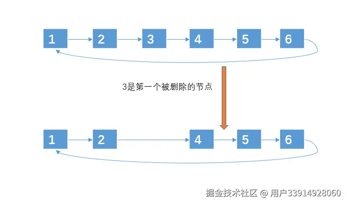 学过链表的人,估计都会用链表来处理约瑟夫环问题,用链表来处理其实和上面处理的思路差不多,只是用链表来处理的时候,对于被选中的编号,不再是做标记,而是直接移除,因为从链表移除一个元素的时间复杂度很低,为 O(1)。当然,上面数组的方法你也可以采用移除的方式,不过数组移除的时间复杂度为 O(n)。所以采用链表的解决方法如下: