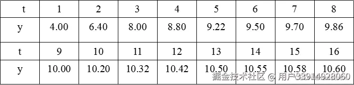 在某化学反应里,测得生成物浓度y(%)与时间t(min)的数据: