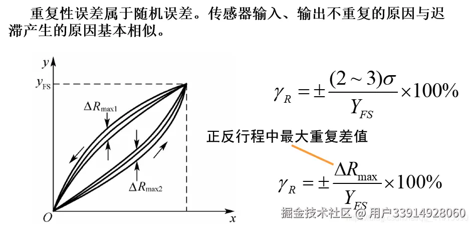 - 重复性:传感器在输入量按同一方向作全量程连续多次变化时,所得特性曲线不一致的程度。