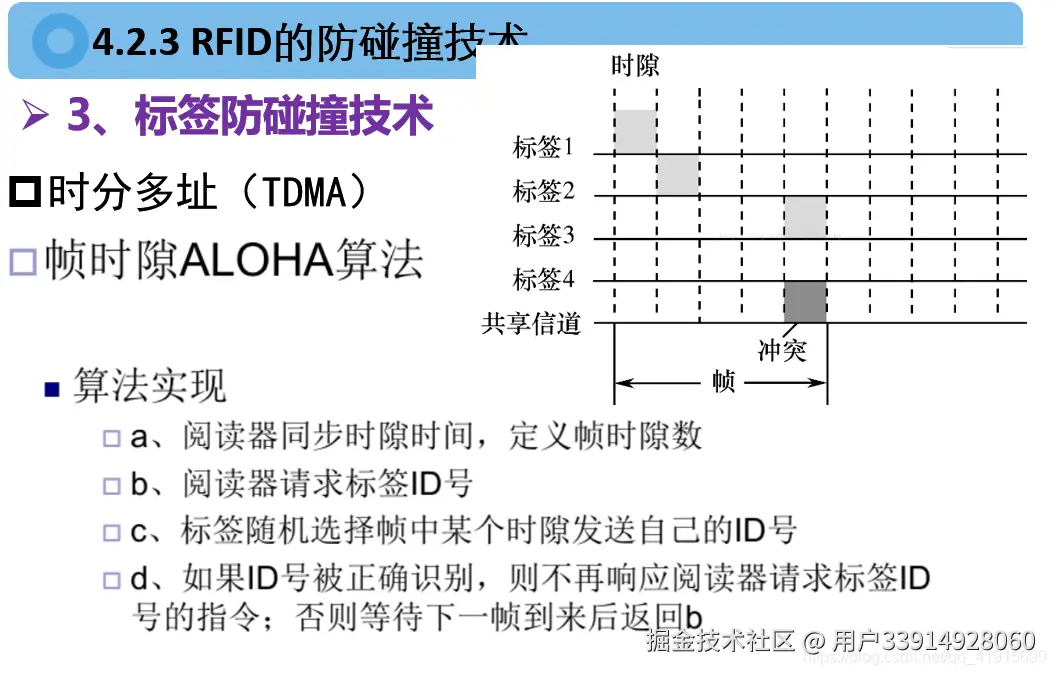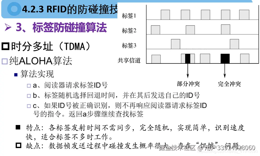 - 标签的防碰撞:四种。时分多址!!!!不需要掌握算法。