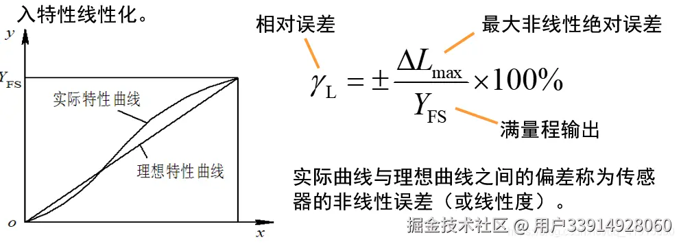 - 线性度:传感器的输出与输入之间数量关系的线性程度。