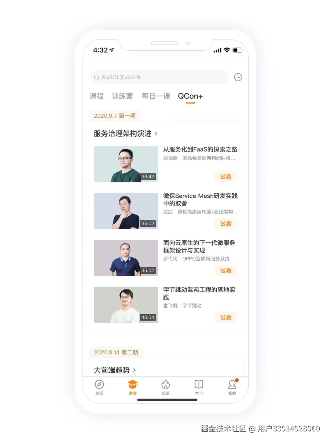 登录「极客时间App」,在讲堂页「QCon+版块」,可以随时随地开启高效学习,讲师配合App内答疑和学习社群互动,案例分享配套的PPT用户可自由下载,重点内容反复学。(为保证顺利学习,请大家将极客时间App更新至版本2.9.0)