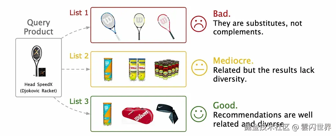 通常,列表 1 提供类似的产品,不太可能一起购买。列表 2 和列表 3 提供互补商品。但是,列表 3 是更佳的选择,因为它提供多种产品,共同满足用户对网球装备的更广泛需求。此示例强调,良好的互补推荐系统应考虑相关性和多样性,以满足用户的期望。