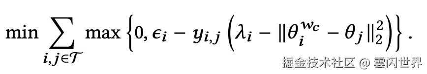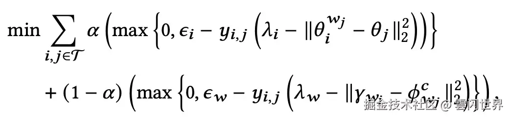 再次,我们使用铰链损失来优化该组件的权重。该损失函数试图确保当 时θ^{w_c}i和之间的距离θ_j小于,当 时大于。λ_i-ε_iy{i,j} = 1λ_i_+iy{i,j} = -1
