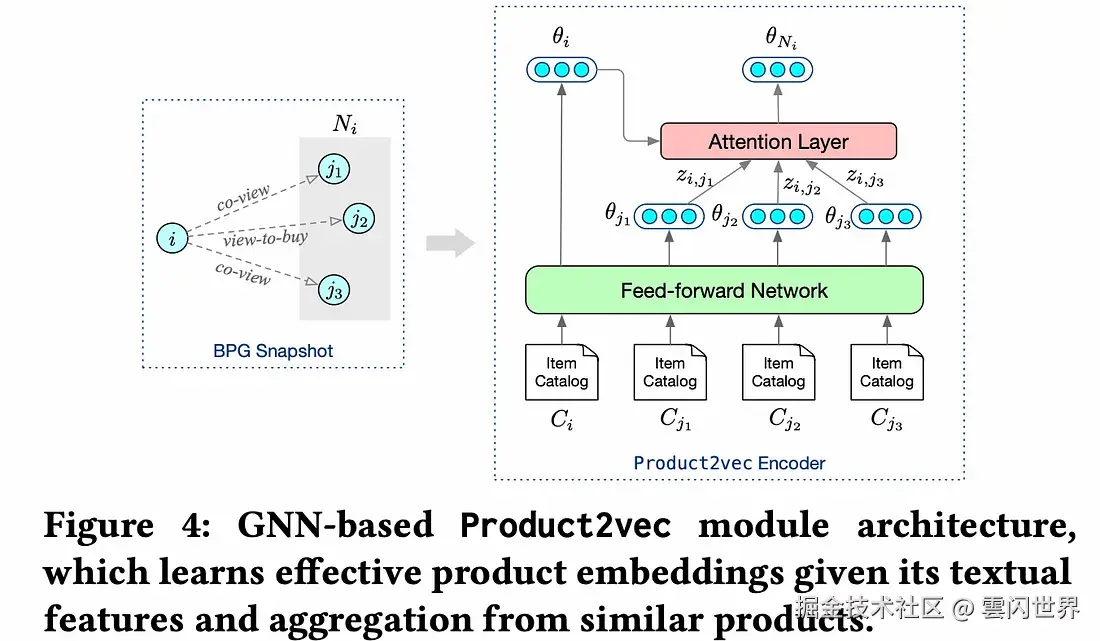 Product2Vec 是一种基于图注意力网络的表示学习模型。它使用 BPG 中的项目描述、历史交互数据和图结构来学习产品嵌入。假设学习到的高度相似产品的嵌入将彼此接近,而互补产品则反之亦然。BPG 子图中连接的产品(B_{cv} ∩ B_{pv}) — B_{cp}很可能相似,并用作训练模型的正对。这些产品既是共同浏览的,也是浏览后购买的,但不是共同购买的。同样,B_{cp} -(B_{cv} U B_{pv})(包含互补且因此不相似的产品的子图)被视为负对。初始嵌入通过前馈层FFN并转换为p- 维嵌入θ。