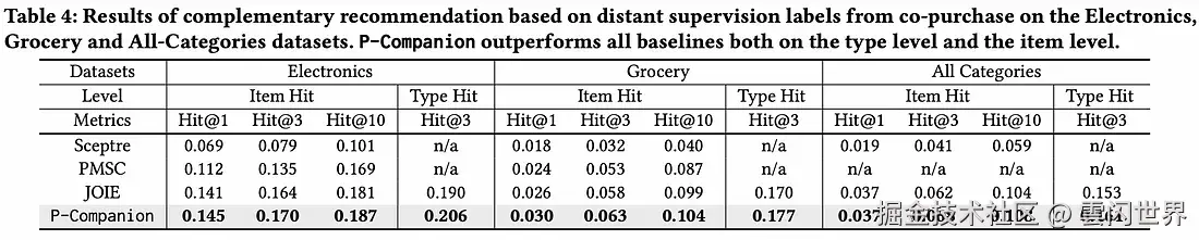 排名指标 Hit@K 用于在测试共同购买数据上评估模型。作者将 P-Companion 与 Sceptre 和 JOIE 进行了比较,发现 P-companion 在不同类别中的表现优于基线模型。它在冷启动项目上表现更好。