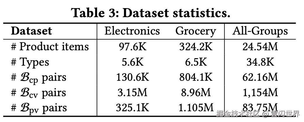 此外,他们还观察到互补关系通常跨越多个产品类别(例如,网球拍可能有网球衫或鞋子等互补品)。为了解决这个问题,他们删除了以前研究中使用的类别限制,并构建了一个B_{cp} -(B_{cv} U B_{pv})涵盖所有产品类型的通用数据集。他们准备了一个包含 2454 万个项目的数据集,涵盖所有产品组的 34.8K 个产品类型。他们构建的 BPG 有 6216 万个共同购买商品对、8375 万个浏览后购买商品对和超过十亿个共同浏览商品对。此外,他们还准备了两个属于电子产品和杂货类别的数据集。详细信息如上表所示。