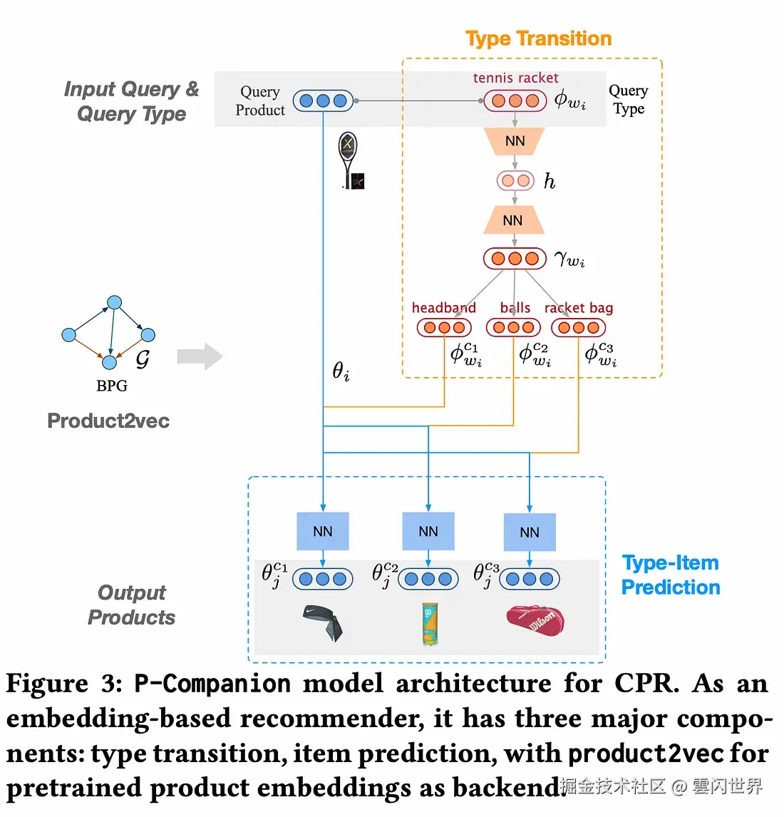 i在推理过程中,给定产品类型为 的商品w_i,我们将从 Product2Vec 中获取商品嵌入θ_i和查询产品类型嵌入φ_{w_i}。利用这些,互补类型转换可以预测前 k 个互补产品类型。互补产品预测将商品嵌入和互补产品类型嵌入{w^{c_1}i, w^{c_2}i, …, w^{c_k}i}作为输入,以生成互补产品。θ_i{φ^{c_1}{w_i}, φ^{c_2}{w_i}, …, φ^{c_k}{w_i}}{θ_j}