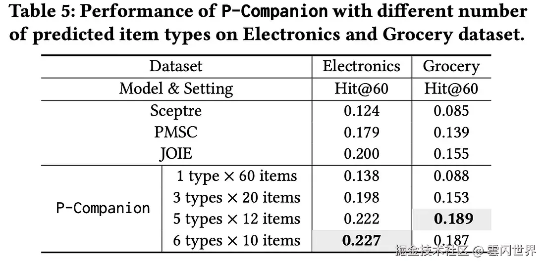 为了评估多样性对推荐的影响,作者通过分析一组常见查询产品的前 60 条推荐来测试 P-Companion。与基线不同,P-Companion 显示来自多个预测互补产品类型的项目以确保多样性。该模型在四种配置下进行了测试:推荐来自前 1 种类型的 60 个项目,将推荐均匀地分为前 3 种、前 5 种和前 6 种类型。这种方法使 P-Companion 能够提供比传统方法更平衡、更多样化的推荐。当模型在电子产品和杂货数据集中推荐更多产品类型时,Hit@K 会增加。
