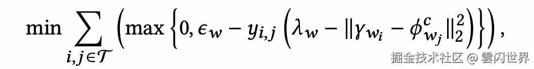 该方程试图在时保持γ_{w_i}和之间的距离φ^c_{w_j}小于,而在时保持和之间的距离大于。λ_w-ε_wy_{i,j} = 1γ_{w_i}φ^c_{w_j}λ_w+ε_wy_{i,j} = -1