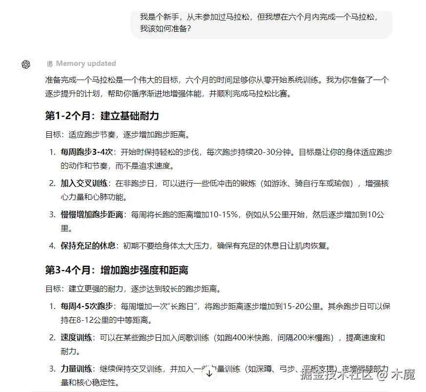 但如果你添加更多信息,如“我是个新手,从未参加过马拉松,但我想在六个月内完成一个马拉松,我该如何准备?”这样会帮助AI给出更有针对性的回答。