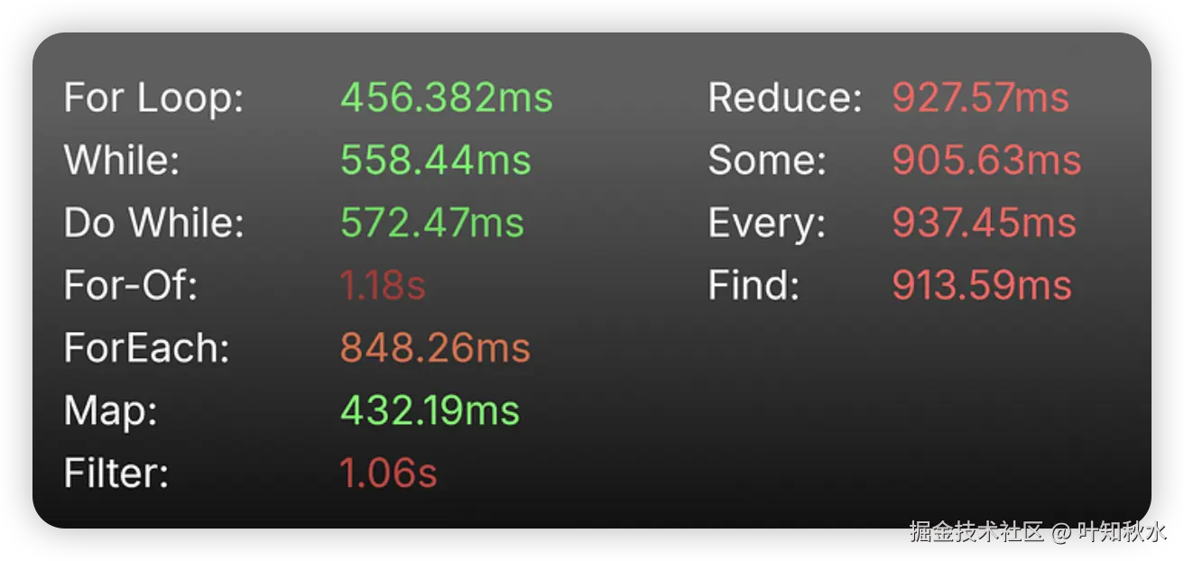 虽然 For-In 的语法与 For-Of 类似,但它不是为数组设计的,因此不在测试之中。 For-In 更适合迭代具有多个属性的对象,因为它迭代的是属性名称(或键)而不是值本身,而与数组一起使用会导致性能问题和意外行为。