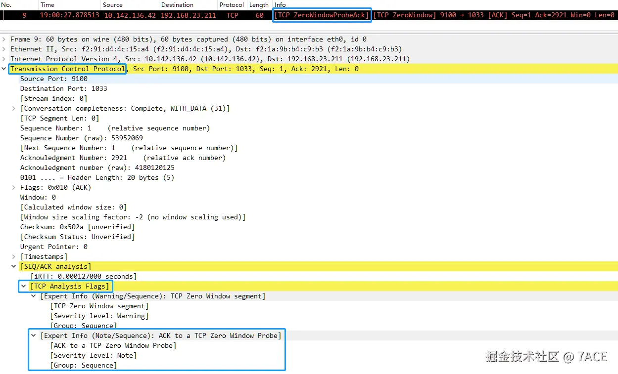 关于 TCP ZeroWindowProbe 、TCP ZeroWindowProbeAck 的实例,依赖于 TCP ZeroWindow 的出现,实际日常抓包中并不是经常会看到,但如果看到了,则代表着本端接收窗口为 0 ,意味着本端因性能或容量等问题而无法接收数据,因此通知发送方暂停发送数据,而发送方满足一定条件,启动零窗口探测定时器,在超时后发出零窗口探测包 TCP ZeroWindowProbe ,接收端根据窗口是否恢复的情况回复 TCP ZeroWindowProbeAck 或者 TCP Window Update 。