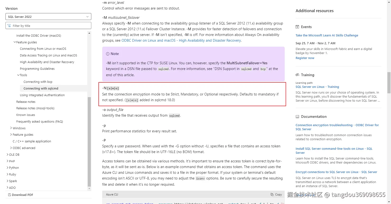 -N[s|m|o]的解释说明: Set the connection encryption mode to be Strict, Mandatory, or Optional respectively. Defaults to mandatory if not specified. ([s|m|o] added in sqlcmd 18.0)