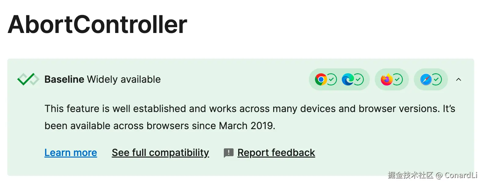 AbortController 的兼容性非常好,很久之前就已经被纳入了 Web 兼容性 Baseline,从 2019 年 3 月起,就可在所有主流浏览器中使用了。