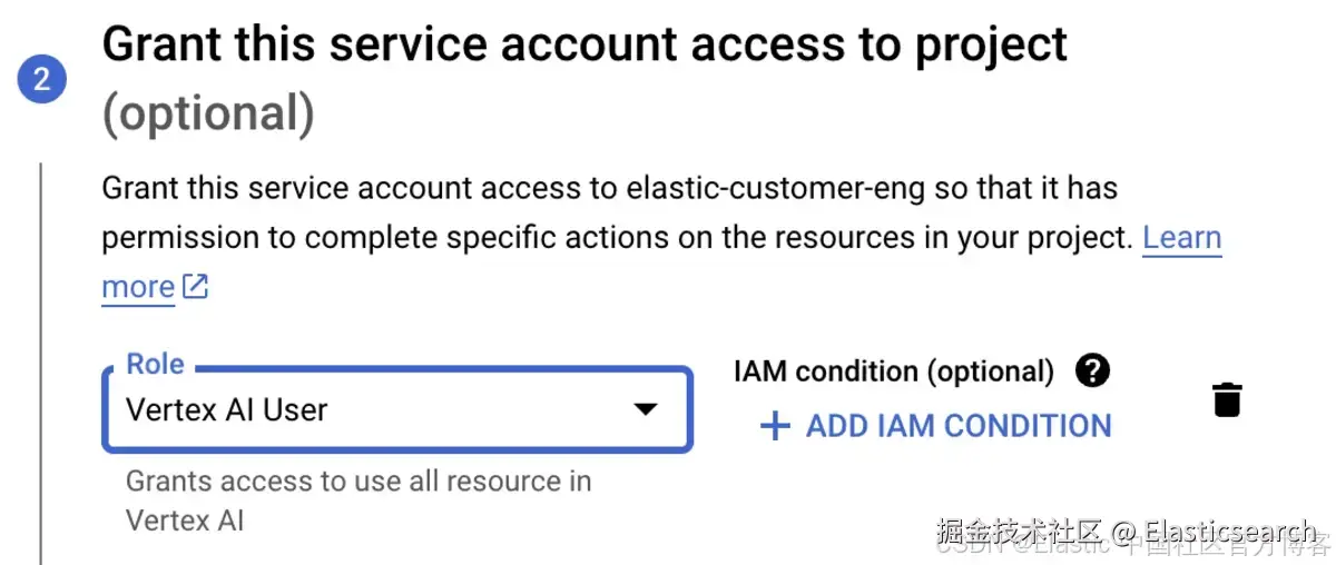 首先,我们将配置一个 Vertex AI 服务帐户,这将允许我们安全地从 Elasticsearch 向 Gemini 模型进行 API 调用。你可以按照此处 Google Cloud 文档页面上的详细说明进行操作,但我们将介绍要点。