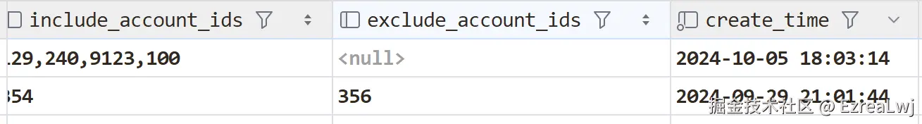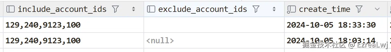 其中我们的 excludeAccountIds 字段的值为空字符串,数据库的插入结果为: