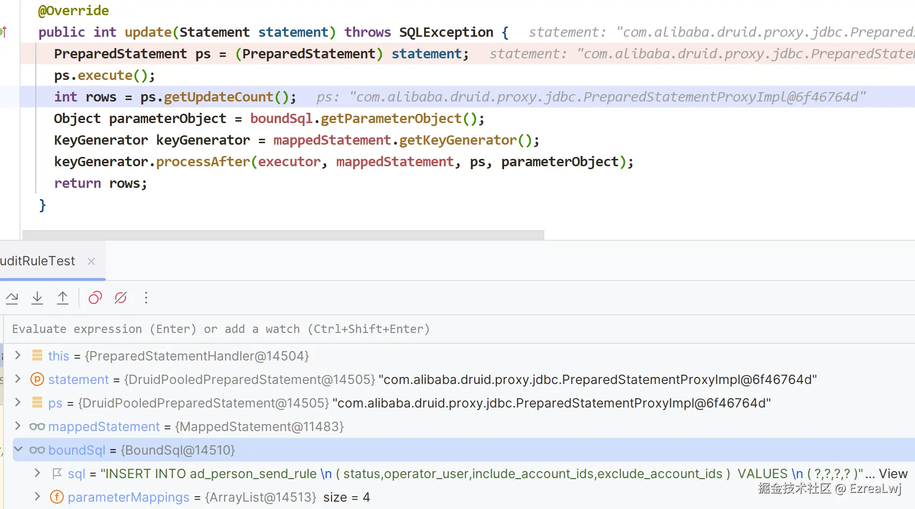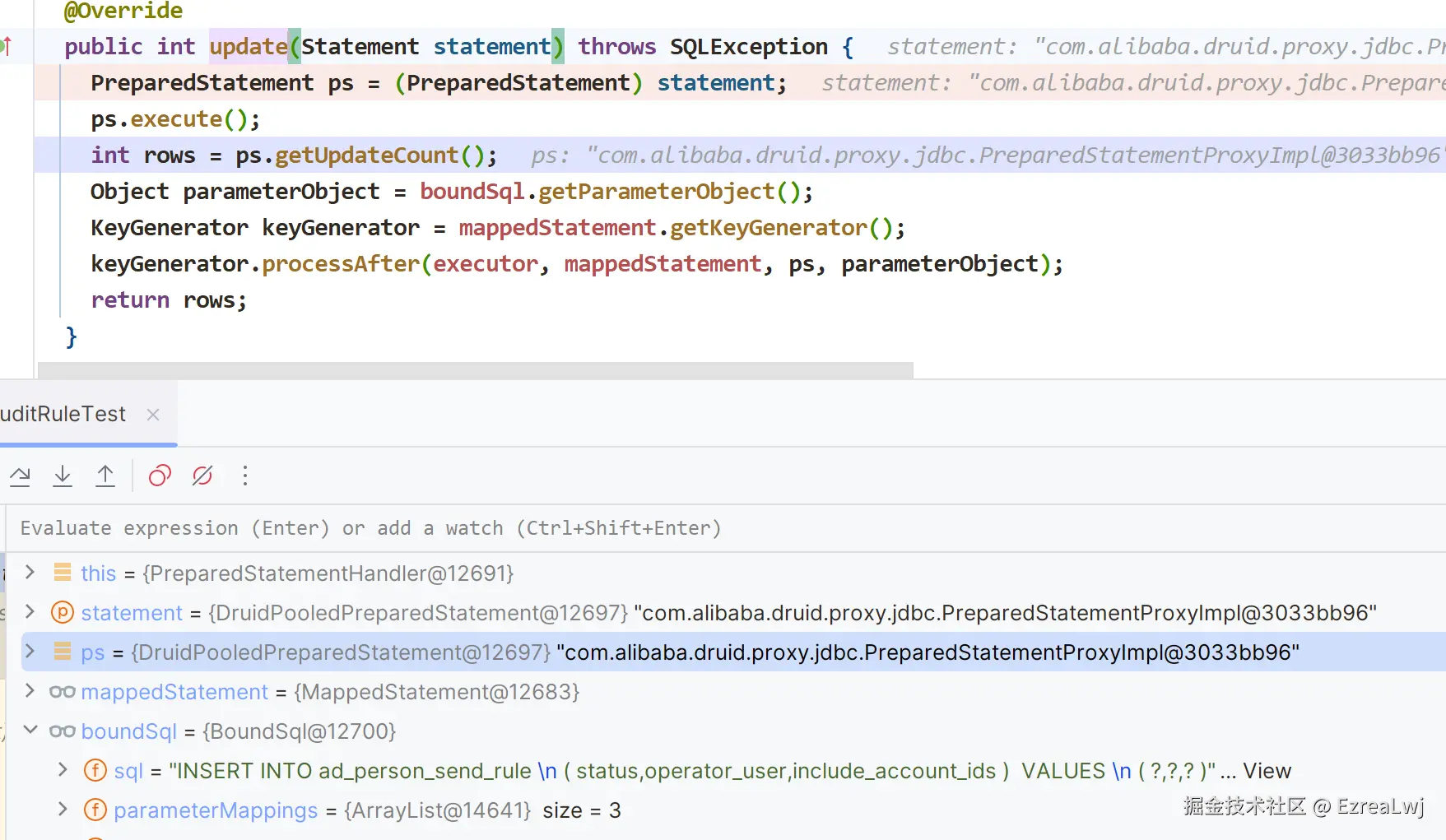 所以,我们可以在 PrepareStatementHandler 声明语句处理器中打下断点,去排查原因。对于我们的 insert 方法来说,在 PrepareStatementHandler 中实际上调用的是 update 方法(其实 insert、update、delete 的 SQL 语句的执行都会调用该类的 update 方法)