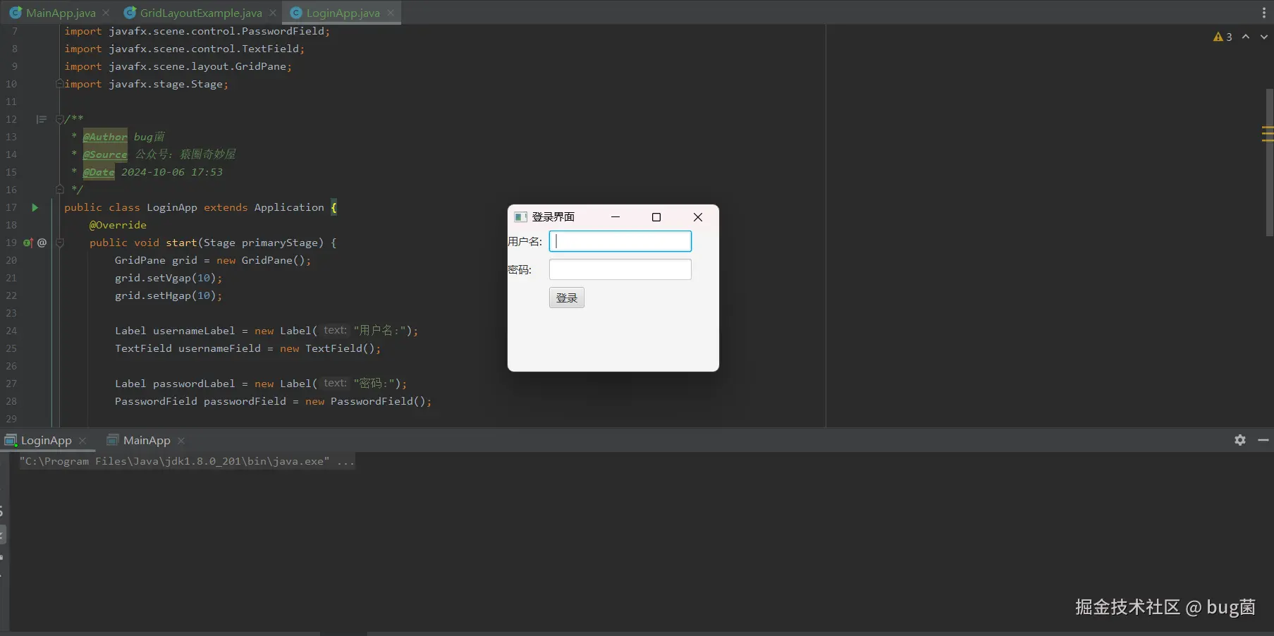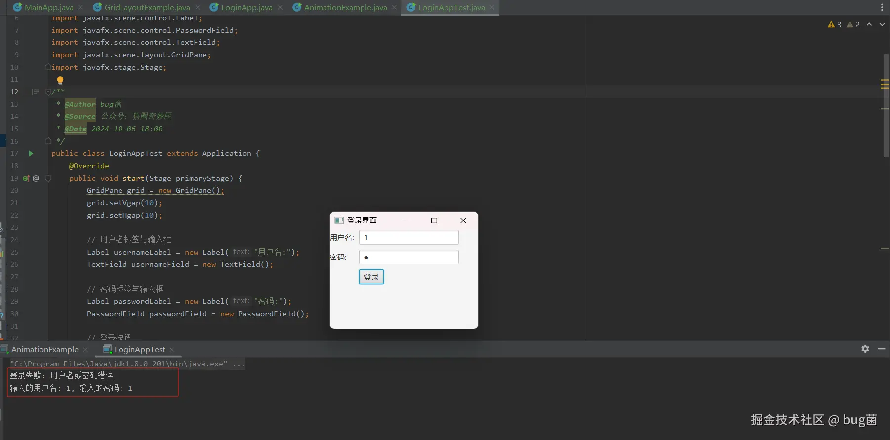 LoginAppTest继承自Application类,表明这是一个 JavaFX 应用程序。Application是所有 JavaFX 应用的基类,start方法是程序的入口。