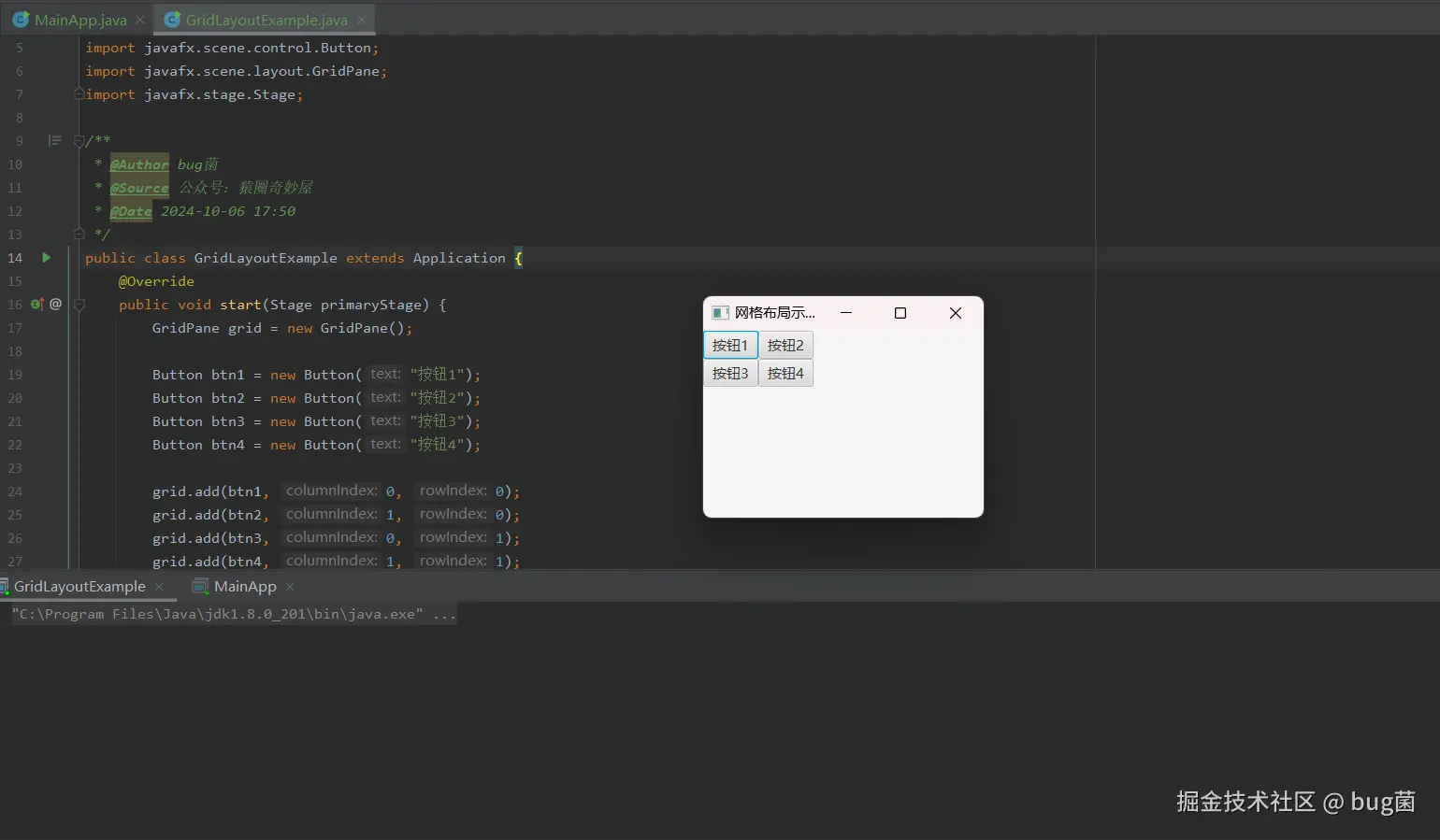 GridPane布局管理器,将控件按照网格的形式排列。 - 按钮创建:创建了四个按钮,分别为 "按钮1"、"按钮2"、"按钮3"、"按钮4"。